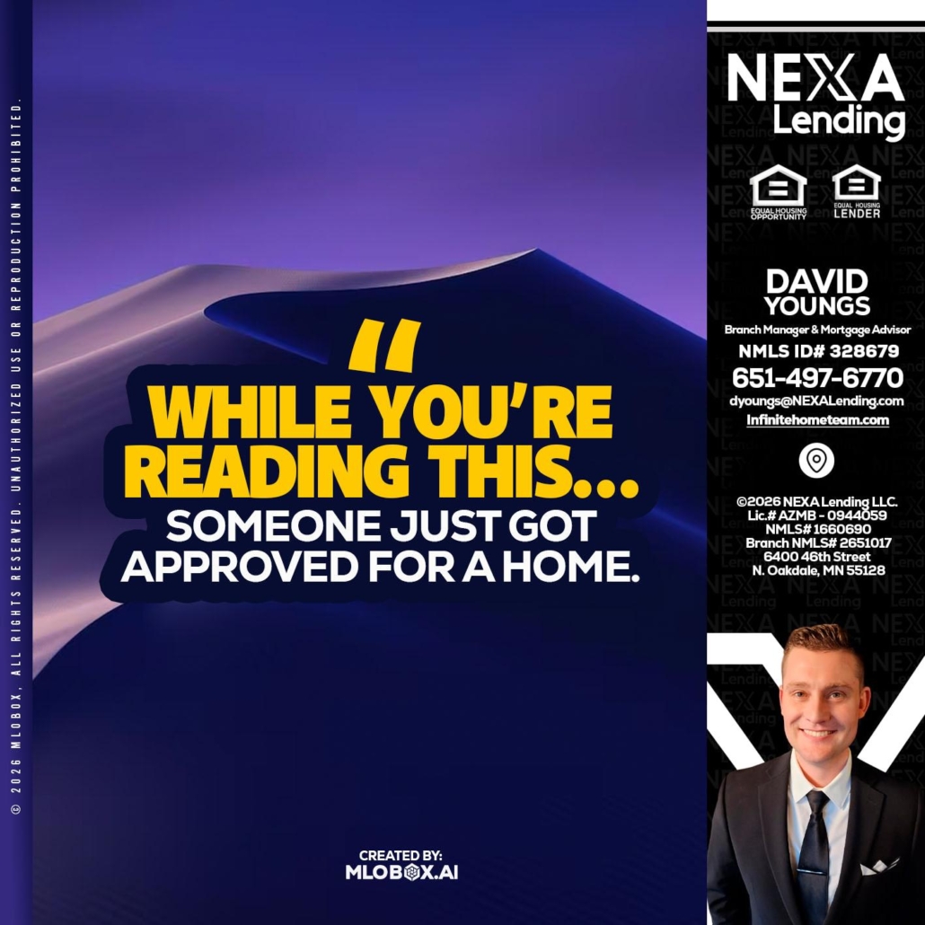 WHILE YOU - David Youngs -Branch Manager & Mortgage AdvisorHi, my name is David Youngs. I’m a Loan Officer with NEXA Lending LLC., offering personalized mortgage solutions, fast customized quotes, great rates and service with integrity.